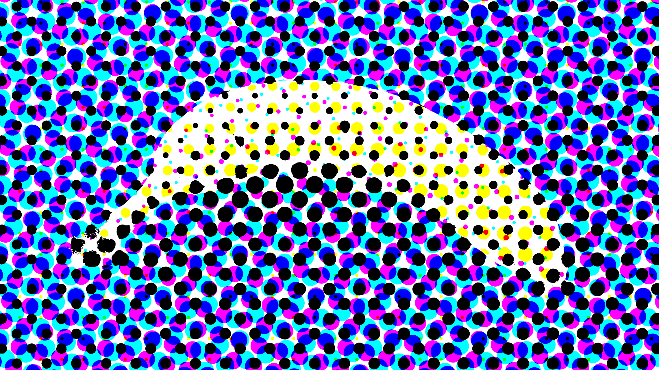 This is based on a classic technique from actual printing: on white paper, you print 4 layers of colored ink dots — cyan (C), magenta (M), yellow (Y), and black (K). The dots on each layer form a halftone pattern, and together the layers combine into a full-color image.